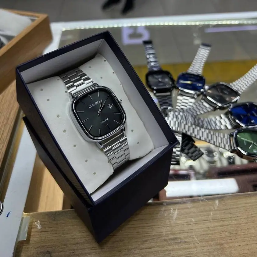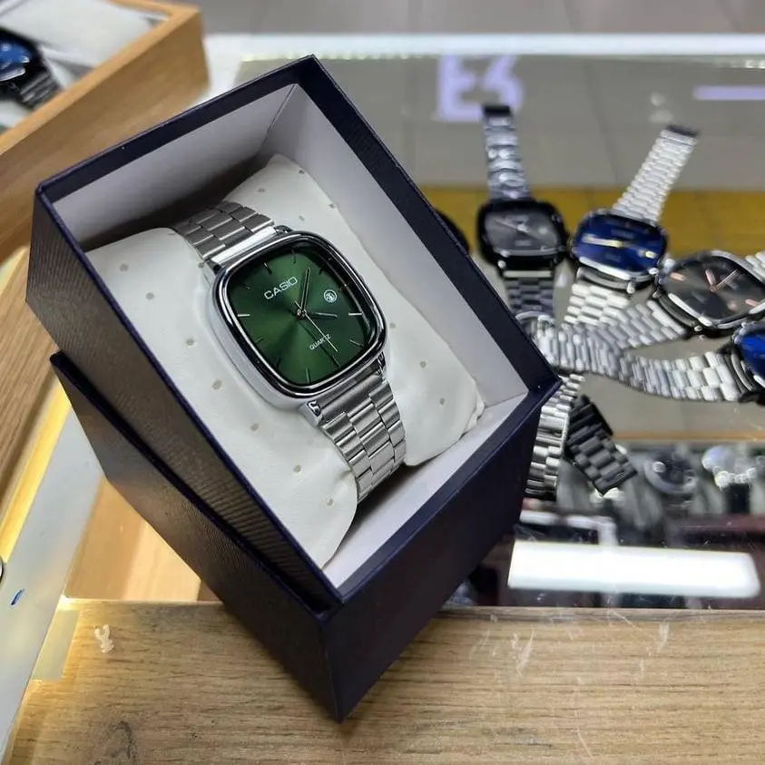 Green, blue, grey, Silver, black with black dial, blue with black dial